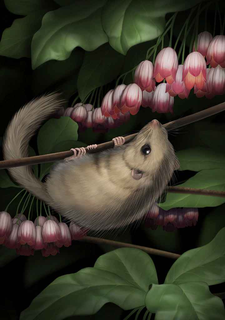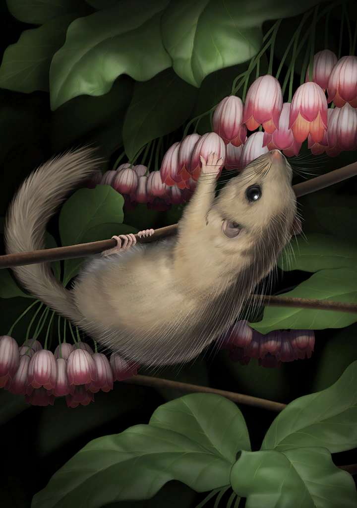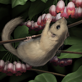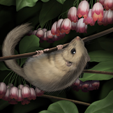 「わたし、こう見えて木登りがとくいなの。だいたい木の上とか 中にいるからかな、“森の妖精”なんて言われちゃったりして、 テレちゃうよぉ~。丸まって何日も寝ちゃうことがあるんだけど、 寝顔がかわいいって評判なの。のぞいてみてもいいけど… そっとだよ。ホ、ホントは恥ずかしいんだから!」