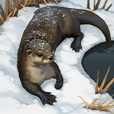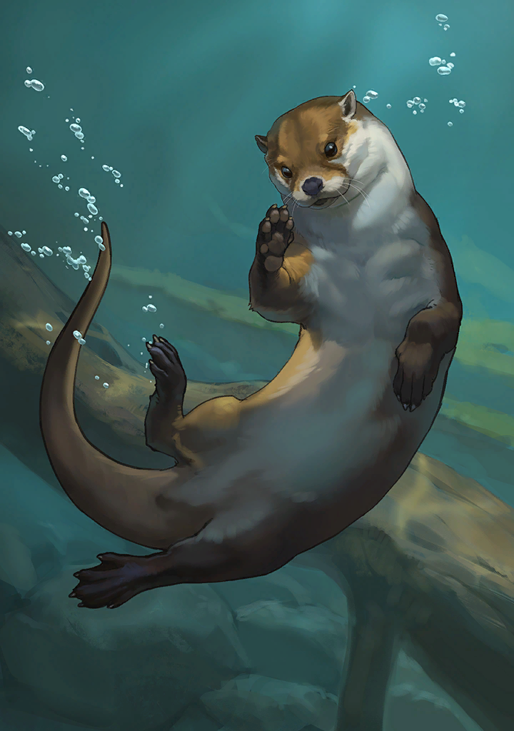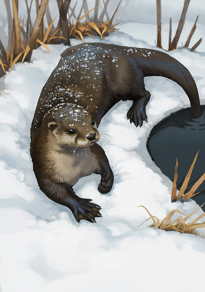 北米大陸の川や湖、湿地帯や海辺などに生息していて、主に魚やカエル、甲殻類などを食べています。体長が66cm~107cm、体重がオスで11kg~15kg、メスで8kgと、コツメカワウソの1.5~2倍の大きさです。生後2か月ほどたち毛がしっかり生えてきたところで、母親から泳ぎを教わります。
