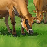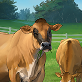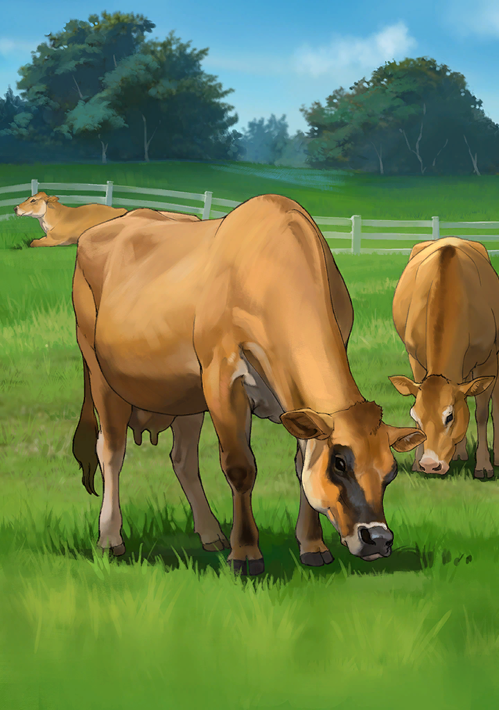 イギリス海峡のジャージー島原産のウシで、乳牛として飼育されています。ホルスタインよりも小柄で乳量は2/3ほどですが、乳脂肪率5%、無脂乳固形分率9%を超える濃厚で風味の良い乳質が特徴です。乳は脂肪球が大きくバター作りに適しています。やや神経質なところもありますが、人懐こい性格です。