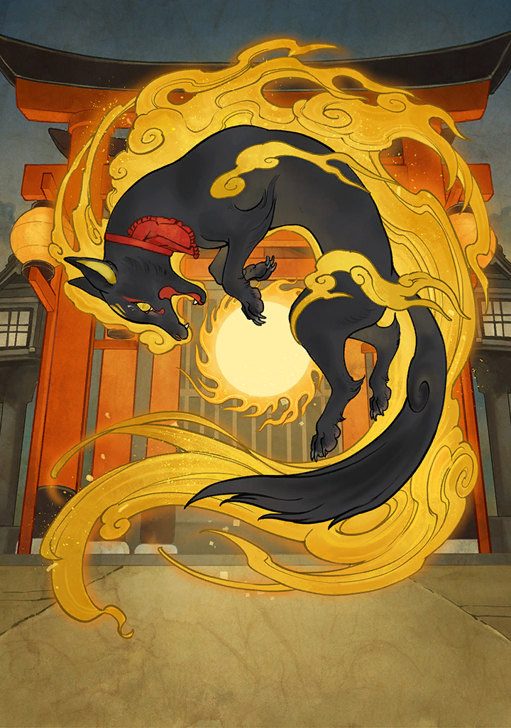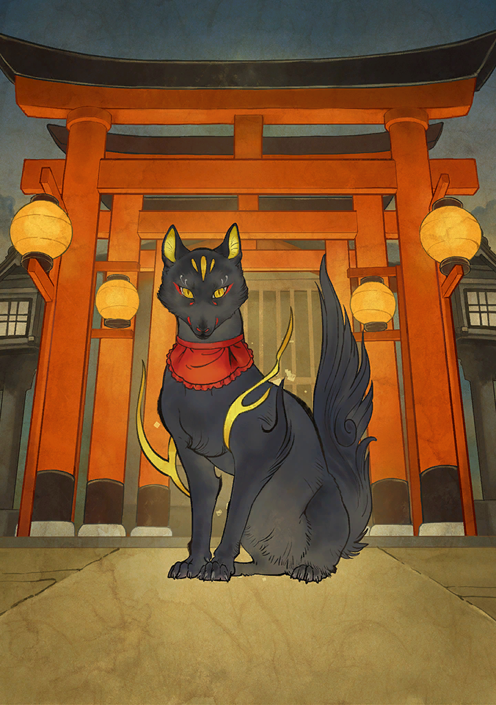 キツネが稲荷神の神使となったのには、いくつもの伝承があります。「食べ物を司る神、御饌津神とキツネの古名の“ケツ“をかけている」「穀物を食べるネズミを捕食するから」「尻尾の色や形が実った稲穂に似ているから」などです。キツネ像が白狐だけでなく時おり黒い姿で描かれることがあるのも「狐狸」の伝承の名残かもしれません。